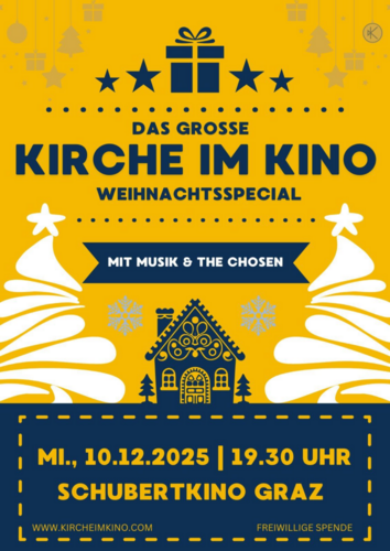 Mi 10. Dez, 19:30, Schubertkino: Go, tell it on the mountain! Kirche im Kino Weihnachtsspecial. Livemusik, Doppelweihnachtsfolge von THE CHOSEN, Impuls. Eintritt frei.