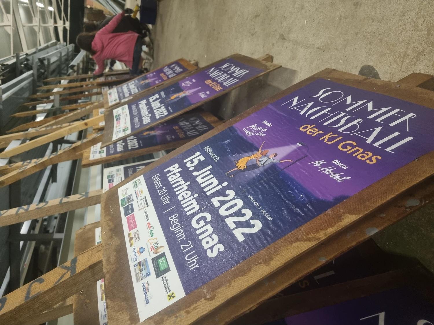 Für unseren Sommernachtsball muss einiges getan werden. So haben wir, wie auch den Jahren zuvor, Plakate vorbereitet und stellen diese in der Gemeinde Gnas auf.