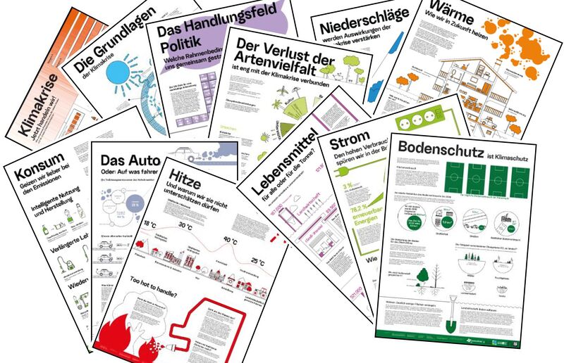 - 20 Themenplakate* (A0-Format) bieten einen Überblick über die zahlreichen Themen und komplexen Zusammenhänge der Klimakrise.