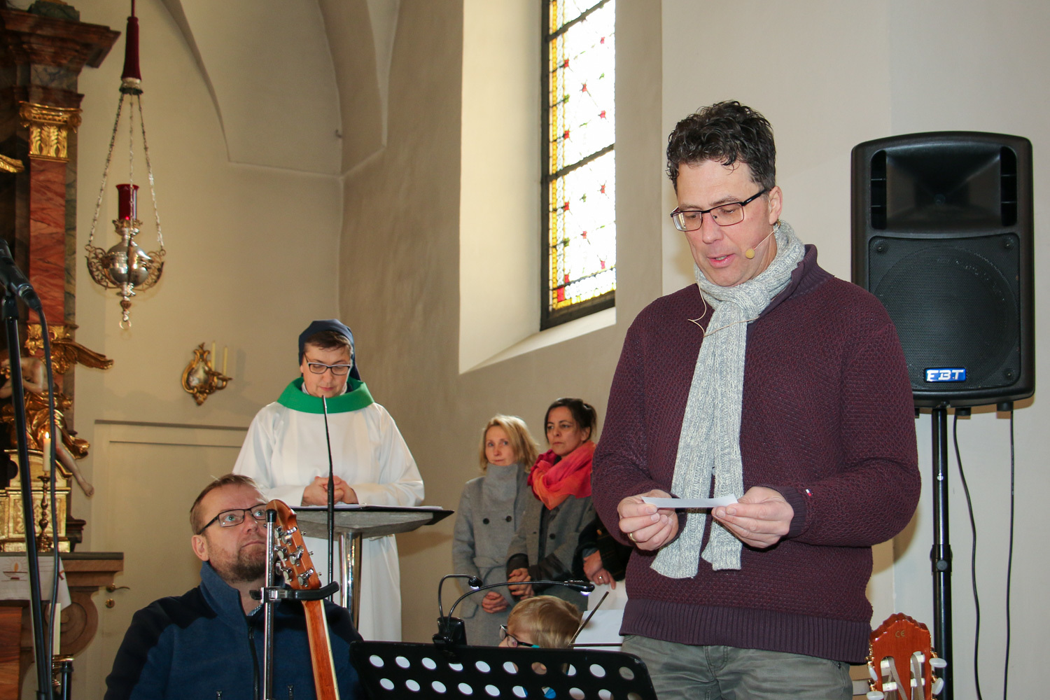 Drei Mütter sprachen bei der Predigt über die Themen aus dem Evangelium (Salz und Licht) und der Taufe. Bei der Taufe stehen drei Symbole im Mittelpunkt: Das Taufwasser, das weiße Kleid und die Taufkerze. Diese Taufkerze brachten die Kinder mit, um sie an der Osterkerze zu entzünden und so an ihre Taufe erinnert zu werden.