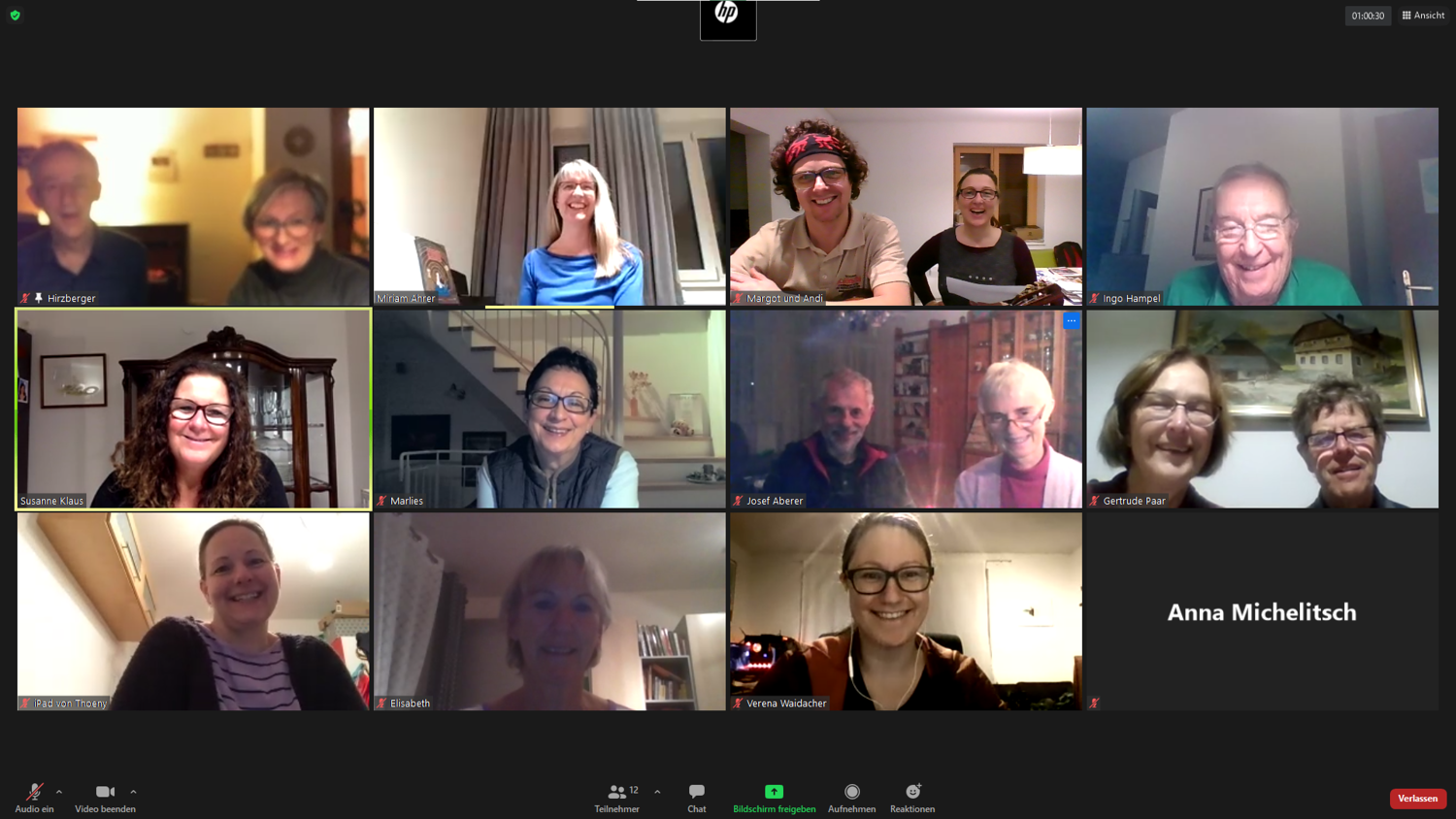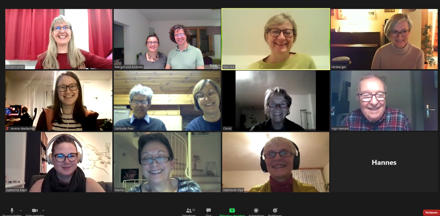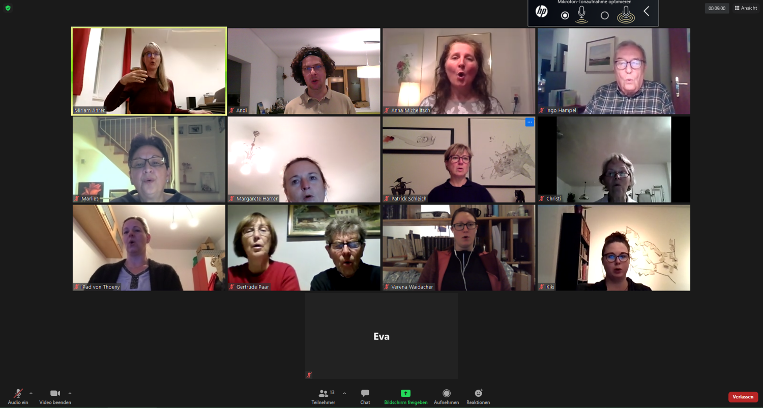 Um den Kontakt nicht ganz zu verlieren, trafen wir uns als Ersatz zu Online-Chorproben in Form von Videokonferenzen. Zwar ist das gleichzeitige Singen wegen der verschiedenen Übertragungsgeschwindigkeiten des Internets nicht möglich, aber mittels Vor- und Nachsingen kann man doch recht gut alte Stücke wiederholen oder auch einfache neue Lieder einstudieren. Besonders während der Adventzeit konnten wir auf diesem Weg sehr stimmungsvoll miteinander singen!