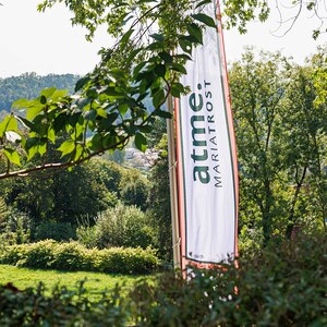 Mit einem Gedankenimpuls laden die Fahnen die Besuchenden zu einem vielfältigen Erleben von MARIATROST ein.