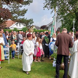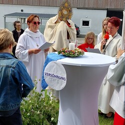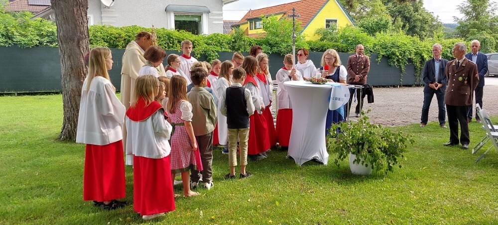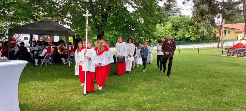 Im Anschluss an die Hl. Messe, zelebriert von Vikar Gerhard Hatzmann und begleitet von Kantorin, Lektoren und liturgischen Diensten beider Pfarren, fand eine Andacht bei den vier Stationen am Dorfplatz statt. Für die kleine Prozession waren vier Brottische als Altäre gerichtet, als Sinnbild für die vier Himmelsrichtungen und dafür, dass Christus der Heiland der ganzen Welt ist. Im gemeinsamen Liedruf "Brot des Lebens" zogen die liturgischen Dienste und die Kinder stellvertretend für das Volk Gottes zu den vier Altären: Brot der Liebe – Brot der Versöhnung – Brot des Friedens – Brot der Hoffnung. Zum Abschluss erteilte Vikar Hatzmann den Eucharistischen Segen, verbunden mit der Einladung, das Allerheiligste gemeinsam zur Kirche zu begleiten. Die Feier schloss mit dem gemeinsam gesungenen "Te Deum" ab. Zu den Feierlichkeiten waren auch die Vereine wie Feuerwehr und ÖKB eingeladen.