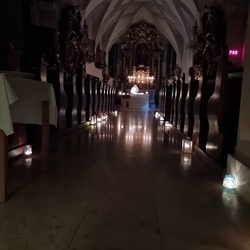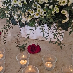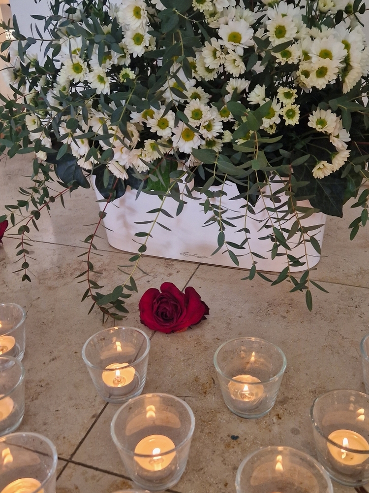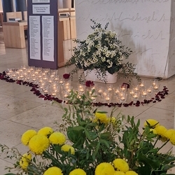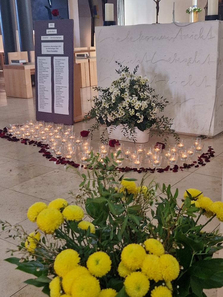 Vor dem Altar brannten 59 Teelichter für alle Menschen, die im letzten Jahr in unserer Pfarre verstorben sind. Ihre Namen wurden noch einmal laut ausgesprochen. Ein Teelicht leuchtete für alle Verstorbenen, die ungenannt blieben.