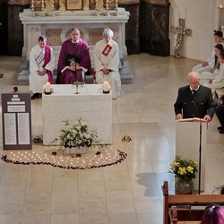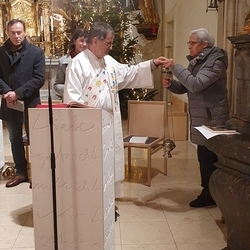 Vor dem Schlusssegen überreichte Ernst Pock im Namen der Pfarre dem neuen Diakon ein Aspergill, mit dem dieser gleich voll Freude die Gläubigen segnete. Für seine Ehefrau Eva, die ihm begleitend zur Seite steht, gab es einen Blumenstrauß, mit den besten Wünschen für sie.