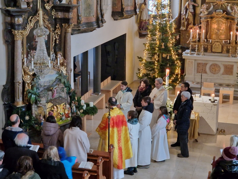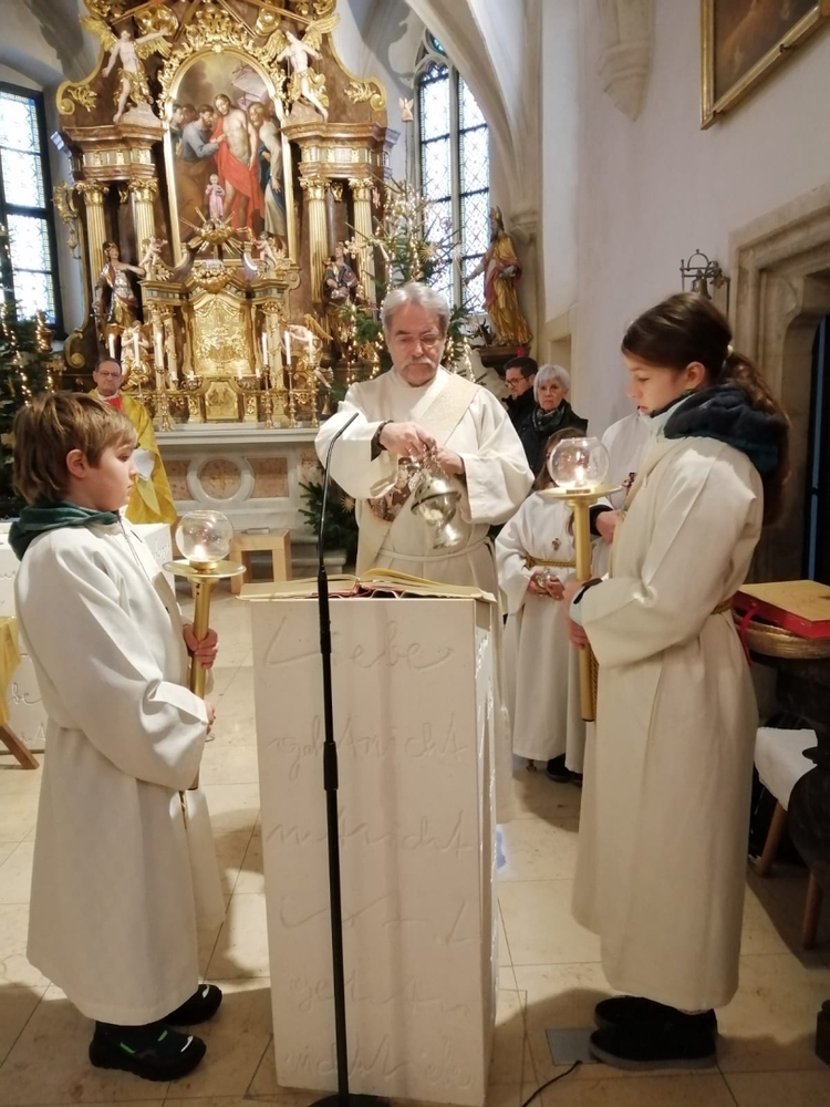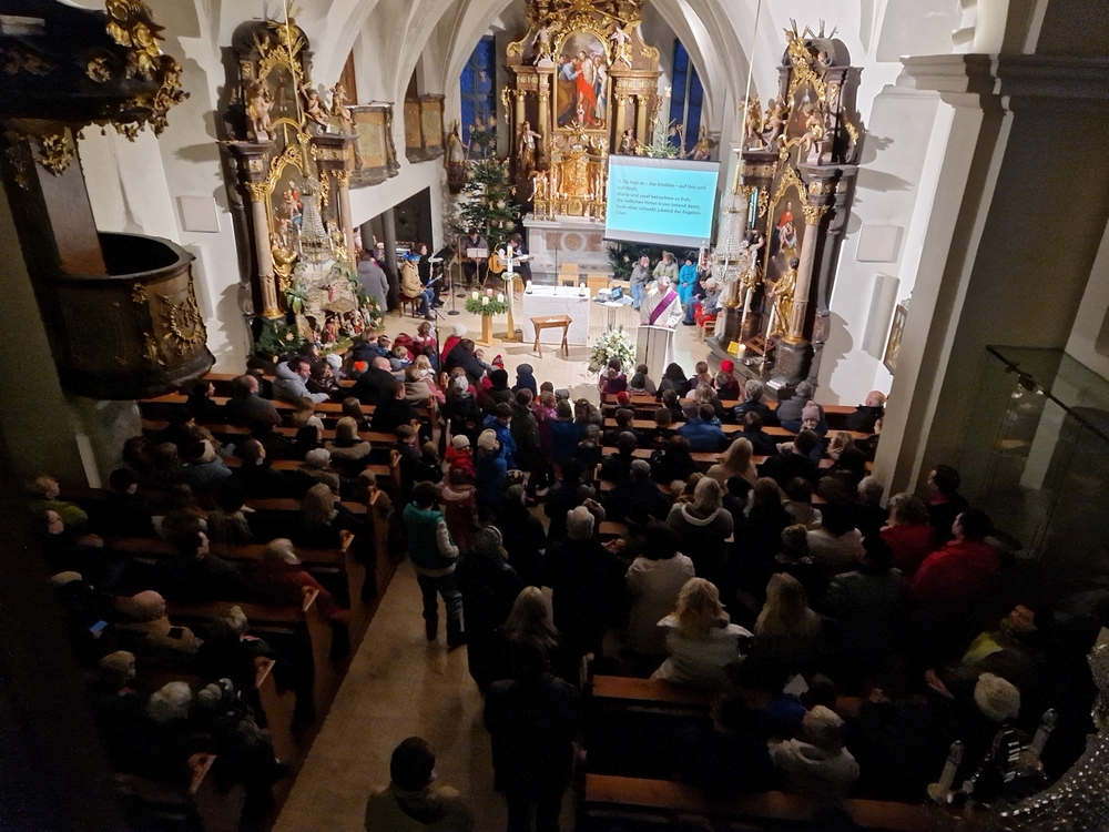 Mit „Es wird schon glei dumpa“ fand der Einzug in die dunkle Kirche statt, doch schon bald wurde es heller und die frohe Botschaft des Weihnachtsevangeliums strahlte auf. Vom sprichwörtlich „fünften Licht“ (auf dem Adventkranz) sprach Diakon Franz in seiner Predigt. Es kann bedeuten: Weihnachten wirkt weiter im Alltag unseres Lebens. …