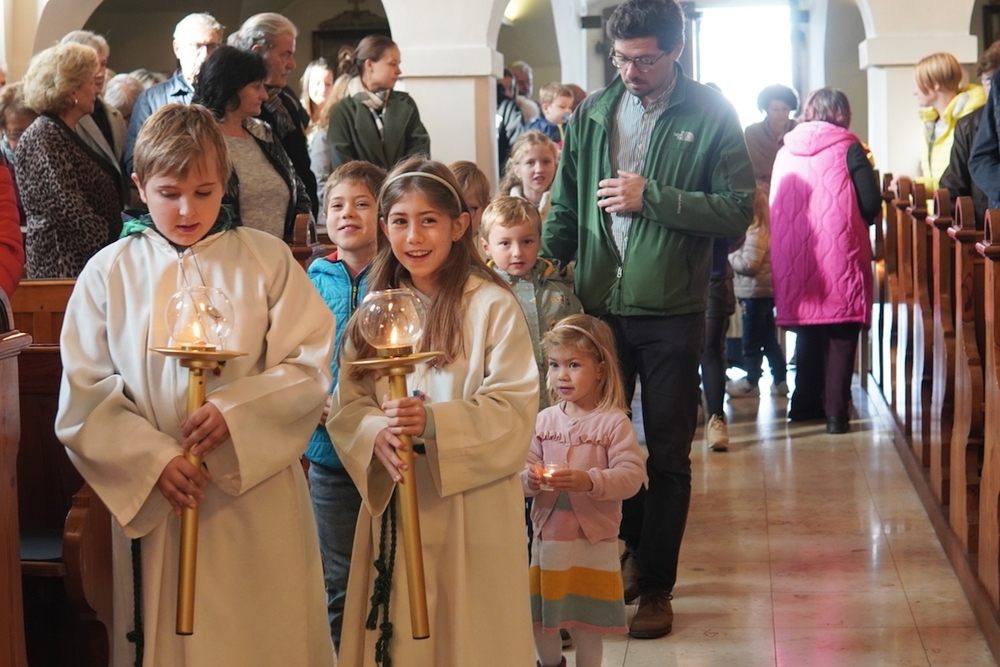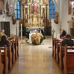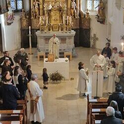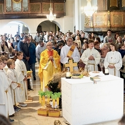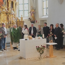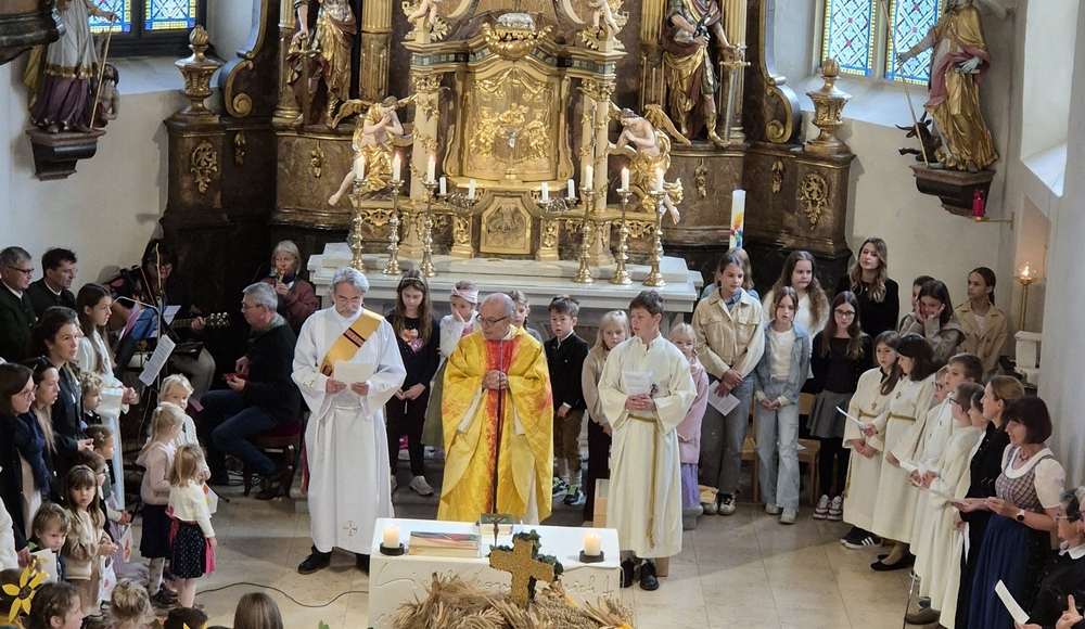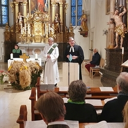 Voll Dankbarkeit und Freude feierten wir das diesjährige Erntedankfest in unserer mit großen und kleinen Leuten gut gefüllten Kirche. Vikar Norbert Glaser zelebrierte die heilige Messe, assistiert von Diakon Michi Zepf und sieben tüchtigen Minis.