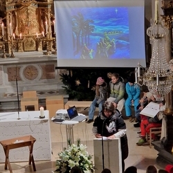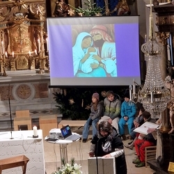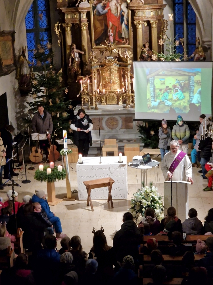 Schon beim Ankommen in der Kirche erklangen viele schöne Weihnachtslieder, die zum Mitsingen einluden und auf die Feier einstimmten. In kindgerechter Erzählweise, mit schönen Bildern untermalt, wurde dann die Botschaft von der Geburt Jesu in unsere Wirklichkeit geholt.