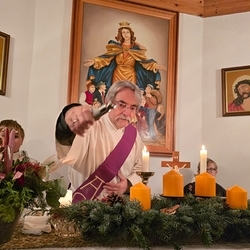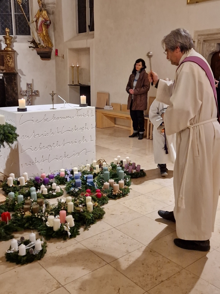 Diakon Michi Zepf segnete im Rahmen von Wort-Gottes-Feiern um 18 Uhr in der Pfarrkirche und um 19 Uhr in der Kaiserwald-Kapelle die herbeigebrachten Adventkränze.