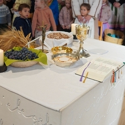 Von der schwungvollen Musik unserer Musikgruppe begeistert, sangen wirklich alle gerne mit, vom Kirchenchor bis zu den VS-Kindern, deren besonderer Erntedankschmuck übrigens nun die Empore im Altarraum ziert.